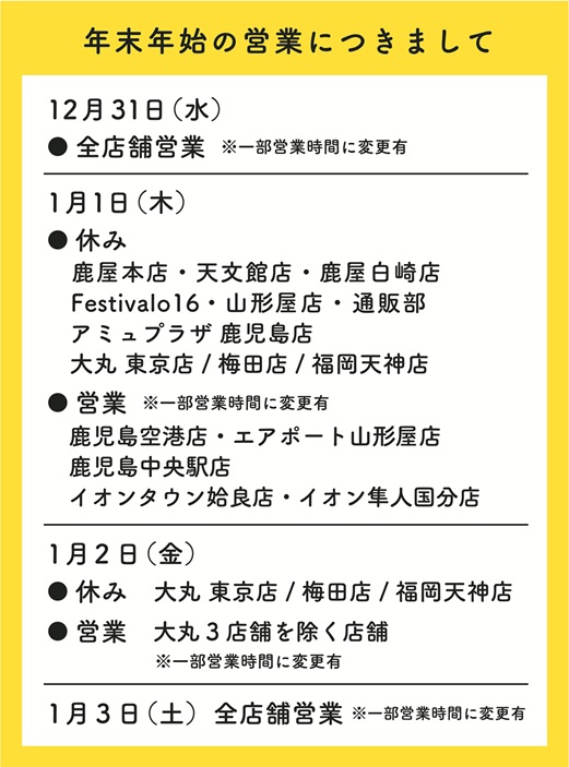 ・6:35~20:35 鹿児島空港店、エアポート山形屋店