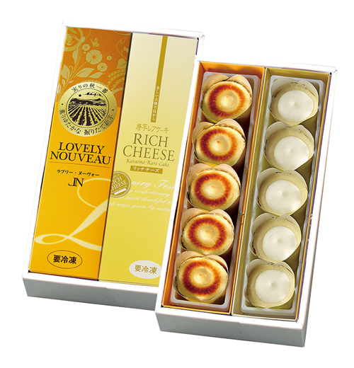 唐芋を栽培する畑を限定し、掘りたての新芋で作った「ラブリーヌーヴォー」と、さつま芋の生地にさわやかな酸味とコクのあるチーズを加えたなめらかな食感のレアケーキに、濃厚な北海道産クリームチーズを重ねた「リッチチーズ」をギフトセットにいたしました。