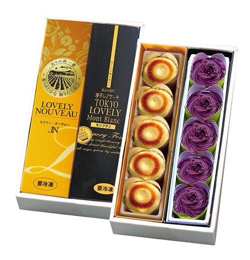 唐芋を栽培する畑を限定し、掘りたての新芋で作った「ラブリーヌーヴォー」と、ラブリーをベースに珍しい紫の唐芋に南九州産の<栗>をブレンドし、モンブラン状に重ね、一サジで二つの風味を楽しめる、とっても贅沢なケーキ「東京ラブリーモンブラン」をギフトセットにいたしました。
