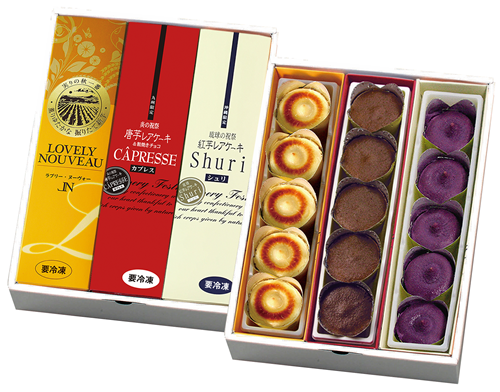 唐芋を栽培する畑を限定し、掘りたての新芋で作った「ラブリーヌーヴォー」と、軽く焼いた生チョコを唐芋レアケーキラブリーの上に重ねた、ほろ苦くてしっとり甘い口どけのケーキ「カプレス」、ラブリーをベースに、紅芋を重層。2種の唐芋の彩り・味・風味を1カップでお楽しみいただけるさわやかな風味「シュリ」のギフトセット。