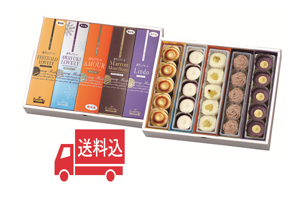| 内容量 | ■お詰合せ内容■ ラブリー5個入×1、淡雪ラブリー5個入×1、アムール5個入×1、マロンモンブラン5個入×1箱、リンド5個入×1箱 |
