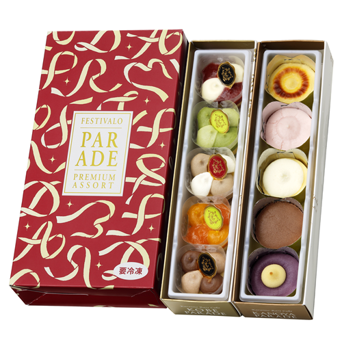 | 内容量 | 10種10個入 左側:神戸パレード(ベリーショコラ、抹茶オレ、カフェラテ、オレンジ&マンゴー、ドゥーブルマロン) 右側:鹿屋パレード(ラブリー、ラムレーズン、カノヤチーズ、カプレス、リンド) |