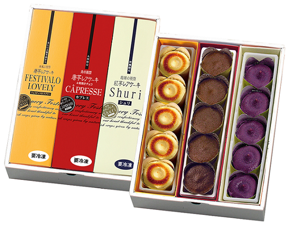 フェスティバロ人気No.1「ラブリー」と、軽く焼いた生チョコを唐芋レアケーキラブリーの上に重ねた、ほろ苦くてしっとり甘い口どけのケーキ「カプレス」、ラブリーをベースに、紅芋を重層。2種の唐芋の彩り・味・風味を1カップでお楽しみいただけるさわやかな風味「シュリ」のギフトセット。